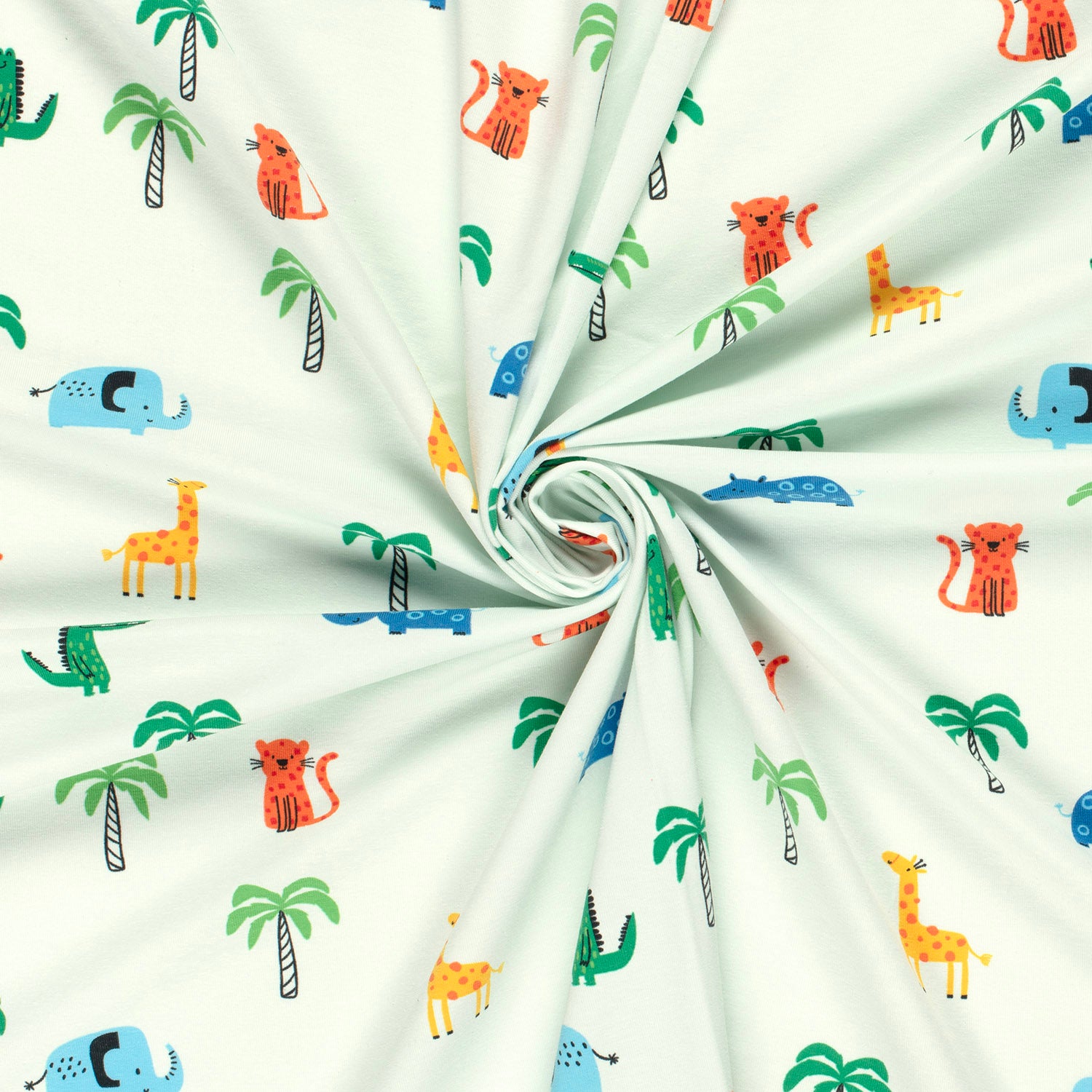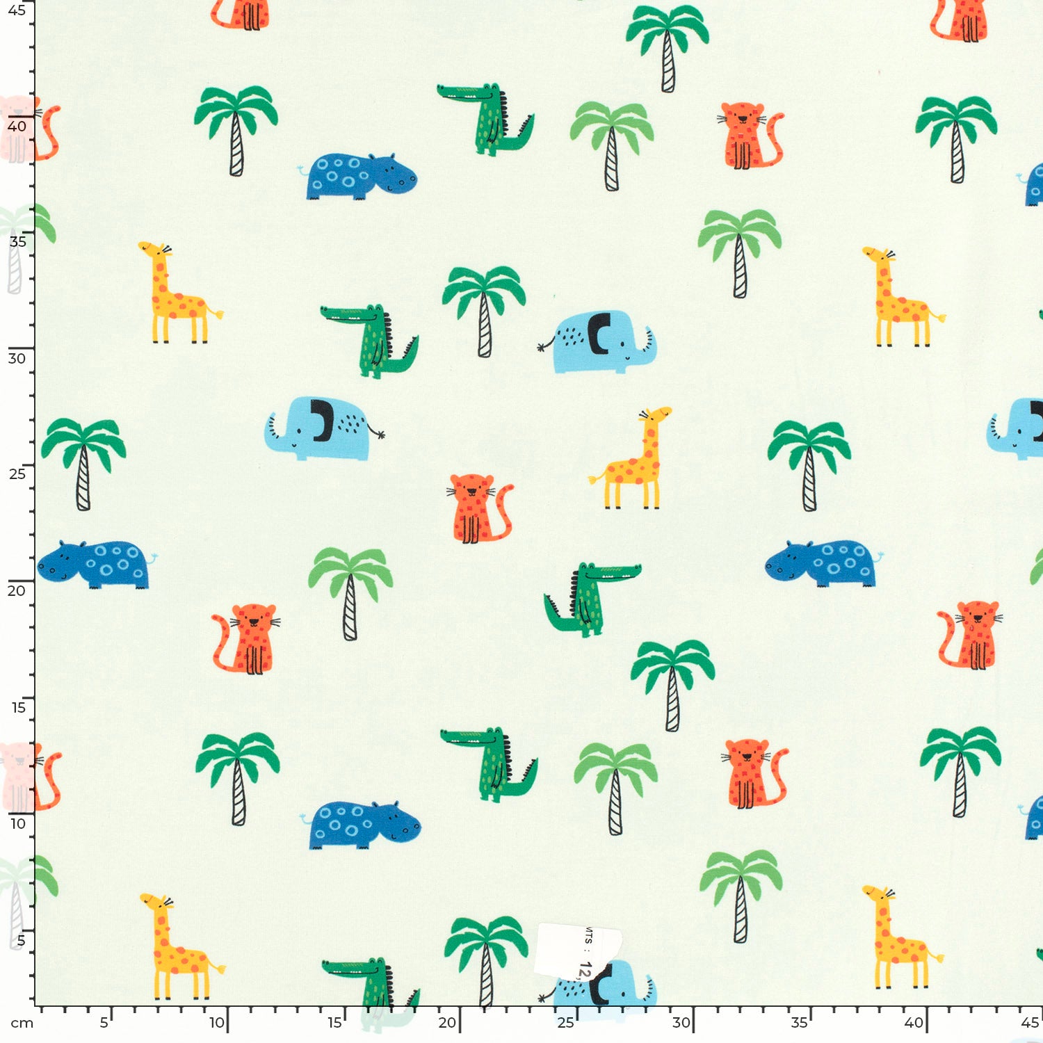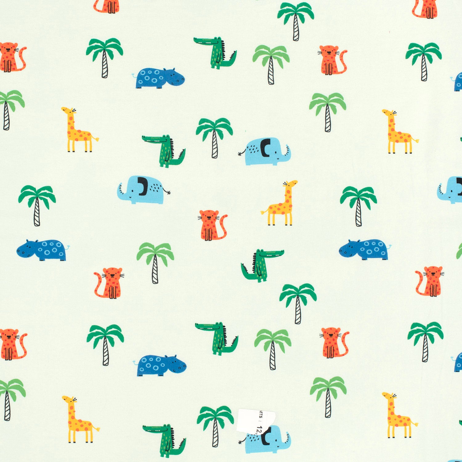 Katoen jersey stof bedrukt met olifanten in de kleur mint (art.nr. 21837/021), maakt deel uit van onze kinderstoffen collectie. Deze stof heeft een breedte van 150 cm en een gewicht van 200 g/m2.