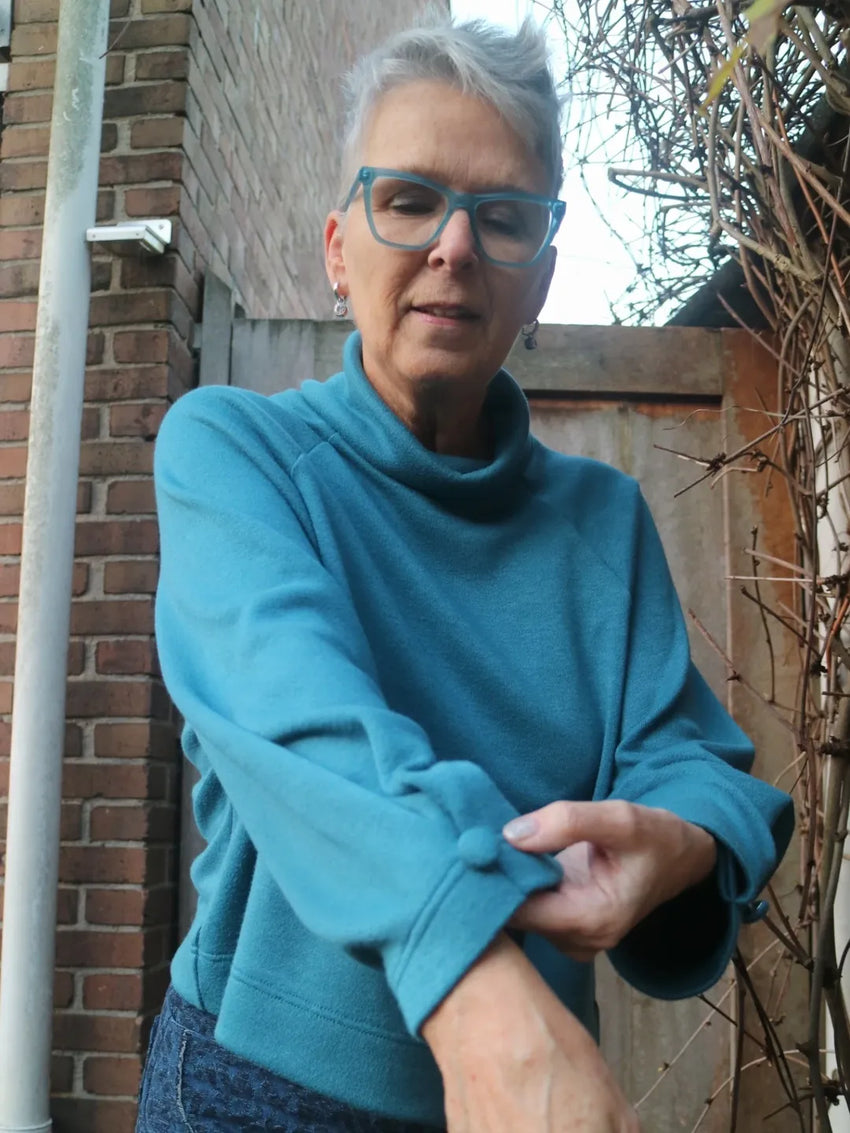 De stof is een heavy brushed knit van Nooteboom Textiles en de mouwen werkte ik af met een leuke knoop. Dit idee pikte ik van het Rafi shirt van @wisj_sofie dat in februari uitkomt.