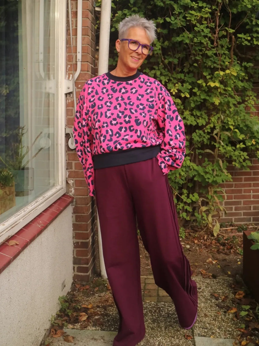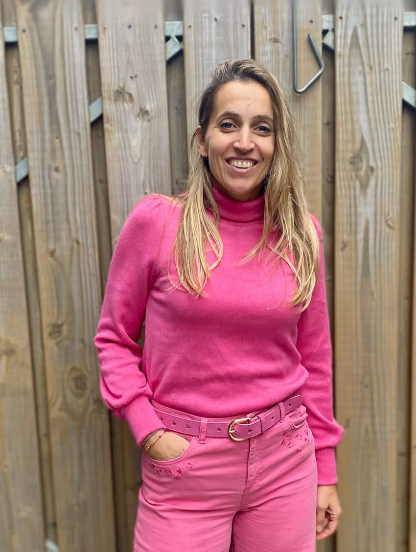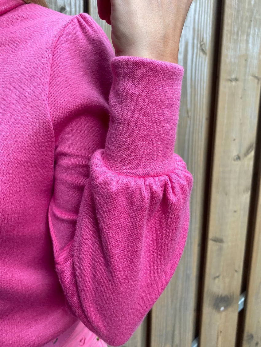 Het was veel te lang geleden dat ik een roze kledingstuk voor mezelf maakte dus toen ik deze heerlijk zachte en soepele roze knit zag wist ik meteen dat ik die zelf ging houden! Ik koos voor een patroon wat ik nog nooit maakte, en dat pakte gelukkig goed uit! De kleine plooitjes in de mouwkop, de brede mouw boord en aangesloten pasvorm, I like it!