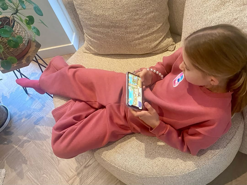 Je ziet ze overal, chill pakken met een wijde broek. Heerlijk comfortabel, warm en zacht. En hoe ik dat weet; omdat ze na het maken van de foto’s het pak de opvolgende 3 dagen meteen aantrok na school (en daarna moest het toch echt in de was van mij 😉)